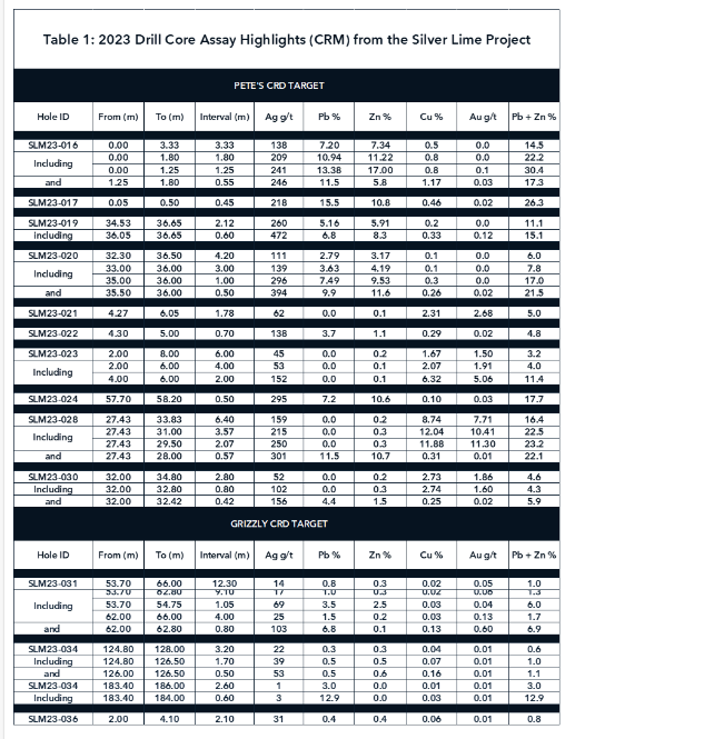 - SLM23-028 (Pete's) intersected 6.40 m grading 159 grams per tonne silver, 8.7 per cent lead, 7.7 per cent zinc and 0.23 per cent copper from 27.43 m depth, including 0.57 m of 301 g/t Ag, 11.5 per cent Pb, 10.7 per cent Zn and 0.31 per cent Cu;
