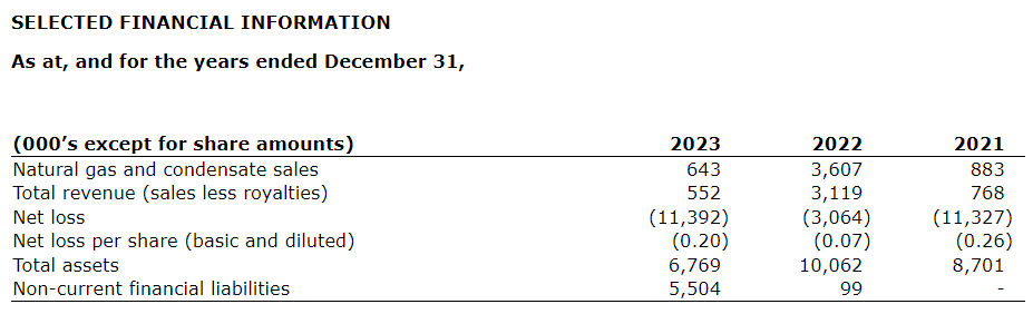 Gas production decreased 74 per cent to 38,097 Mcf (thousand cubic feet), or an average of 104 Mcf per day, for the year ended Dec. 31, 2023, from 146,355 Mcf, or an average of 401 Mcf per day, in 2022. The company also produced nine barrels of condensate in 2023 compared to 474 barrels in 2022. The 2022 gas production average was much higher due to the successfully drilled Poyraz 7 infill well that began producing in June, 2022, but has since naturally declined. The other Poyraz Ridge wells have been producing for more than six years, with water production and natural pressure declines reducing gas production rates.