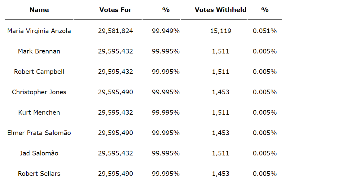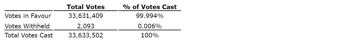 A total of 33,633,502 common shares were voted at the meeting, representing 34.67 per cent of the votes attached to all outstanding common shares of the company. All matters presented for shareholder approval at the meeting were duly authorized and approved.