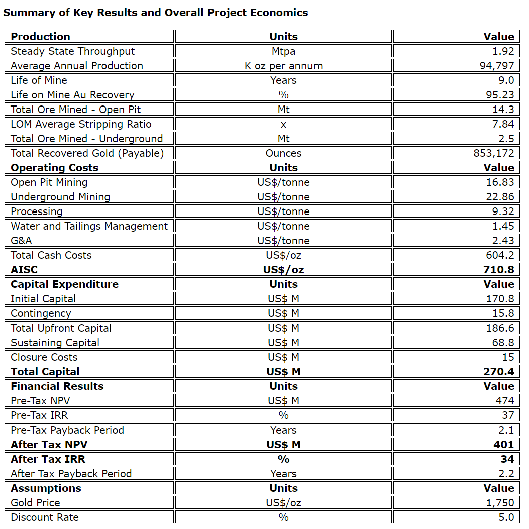 • Average annual gold production of 94,797 ounces per annum over 9 year Life of Mine ("LOM")