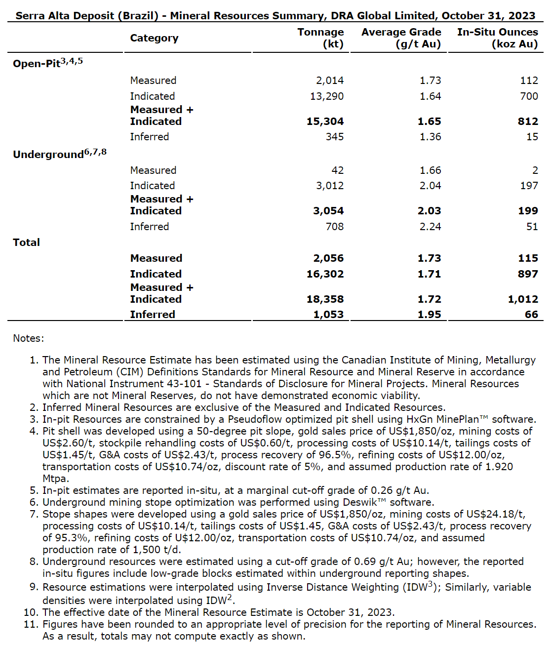 Mineral Resource EstimateThe MRE was established using data from boreholes drilled and sampled up to December 31, 2022. The in-pit resource estimate for the Serra Alta deposit includes Measured and Indicated Resources of 15,304 kt @ 1.65 g/t Au for 812 koz, and Inferred Resources of 345 kt @ 1.36 g/t Au for 15 koz; the underground portion includes Measured and Indicated Resources of 3,054 kt @ 2.03 g/t Au for 199 koz, and Inferred Resources of 708 kt @ 2.24 g/t Au for 51 koz. The resource estimate has been prepared using a marginal cut-off grade of 0.26 g/t Au for the in-pit resources; underground resources include low-grade blocks falling within underground reporting shapes to reflect realistic mining logistics. Both the open-pit and underground resources are reported using a gold price of US$1,850. Additional details on mining and processing modifying factors are provided in the footnotes for the table below.