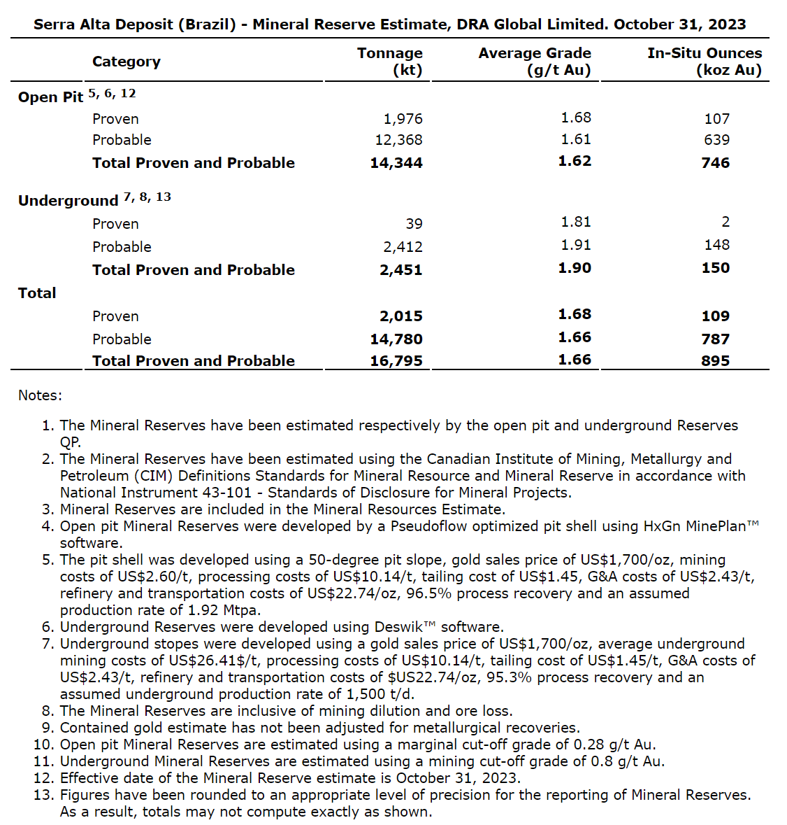 The Mineral Reserve Estimate was established using the Mineral Resource Estimate with the effective date of October 31, 2023. The total mineral reserve estimate of the Serra Alta deposit includes Proven Reserves of 2 Mt @ 1.68 g/t Au for 109,000 oz (in-situ) and Probable Reserves of 14.8 Mt @ 1.66 g/t Au for 787,000 oz (in-situ). The reserve estimate has been prepared using a cut-off grade of 0.28 g/t Au for the in-pit reserves, and 0.8 g/t Au for the underground reserves. Both the open-pit and underground reserves are reported using an assumed gold sales price of US$1,700. Additional details on mining and processing factors are provided in the footnotes for the tables below.