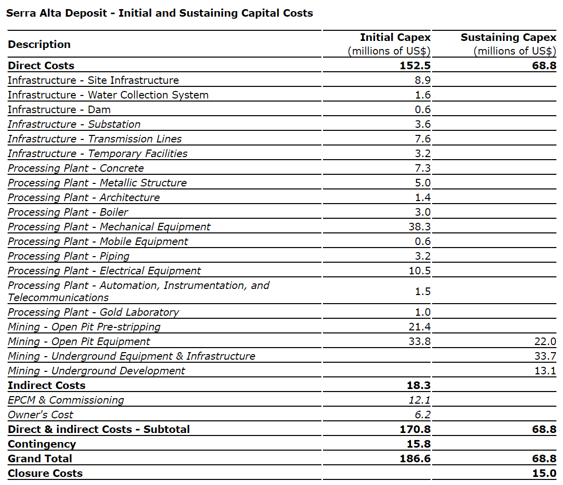 The table below provides details of the Capex required for the construction of the mine, processing plant, and all associated infrastructure, with an estimated total initial cost of US$186.6 million and US$ 68.8 million in sustaining costs.