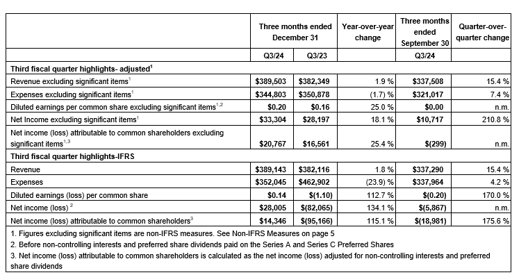 Highlights for the third fiscal quarter and the first nine months (year to date (YTD)) of fiscal 2024 (all dollar amounts stated in thousands of Canadian dollars unless otherwise indicated):
