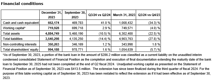 Nine-month net income before taxes, excluding significant items (1), of $94.1-million, a decrease of 14.1 per cent compared with the first nine months of fiscal 2023 (on an IFRS basis, year-to-date net income before taxes of $42.7-million, compared with a net loss before taxes of $39.9-million in the first nine months of fiscal 2023);