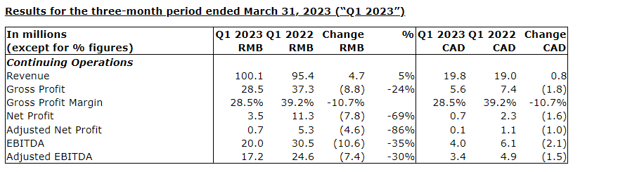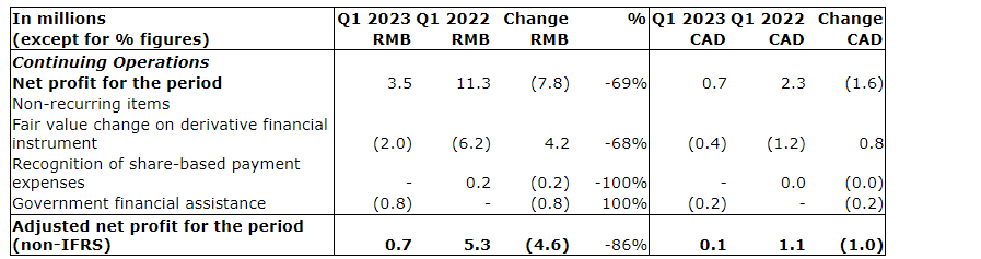 Net profit in Q1 2023 was 3.5 million renminbi (approximately $700,000), a decrease of 7.8 million renminbi (approximately $1.6-million), or 69 per cent, from 11.3 million renminbi (approximately $2.3-million) in Q1 2022. Net profit in Q1 2023 included certain adjusting items. On a comparable basis, after excluding the gain of 2.0 million renminbi (approximately $400,000) in fair value change on derivative financial instrument of loan discharge agreement in respect of the commitment by the estate of Mr. Lin to subscribe for common shares under a related party loan (please refer to the related party transaction section of the MD&A (management's discussion and analysis) for more details), recognition of share-based payment expenses of nil (Q1 2022: 200,000 renminbi) and the non-recurring government financial assistance of 800,000 renminbi (approximately $200,000) (Q1 2022: nil), the company reported an adjusted net profit of 700,000 renminbi (approximately $100,000) in Q1 2023, a decrease of 4.6 million renminbi (approximately $1.0-million), or 86 per cent from an adjusted net profit of 5.3 million renminbi (approximately $1.1-million) reported in Q1 2022.