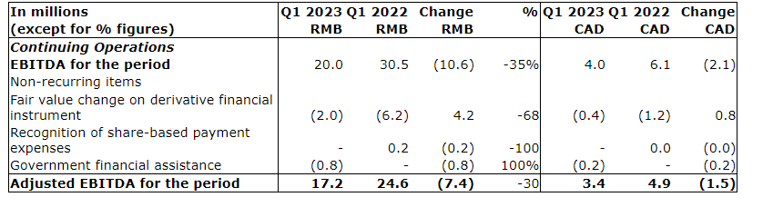 On a comparable basis, the adjusted EBITDA in Q1 2023 was 17.2 million renminbi (approximately $3.4-million), a decrease of 7.4 million renminbi (approximately $1.5-million), or 30 per cent, from 24.6 million renminbi (approximately $4.9-million) in Q1 2022.