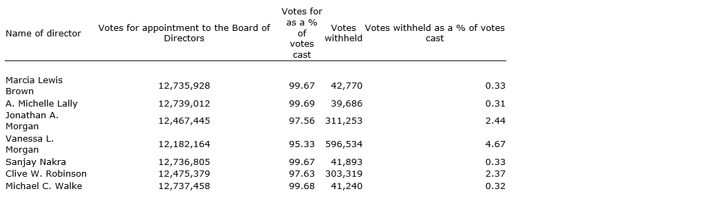 Each of the seven nominees proposed by management for election as a director of the corporation, as listed in the management information circular dated Feb. 27, 2026, was elected as a director of the corporation by votes cast at the meeting. The detailed results of the vote for the election of each director are set out in the attached table.