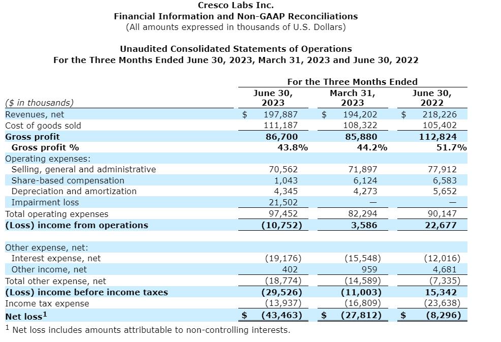 CRESCO LABS REPORTS SECOND QUARTER 2023 RESULTS