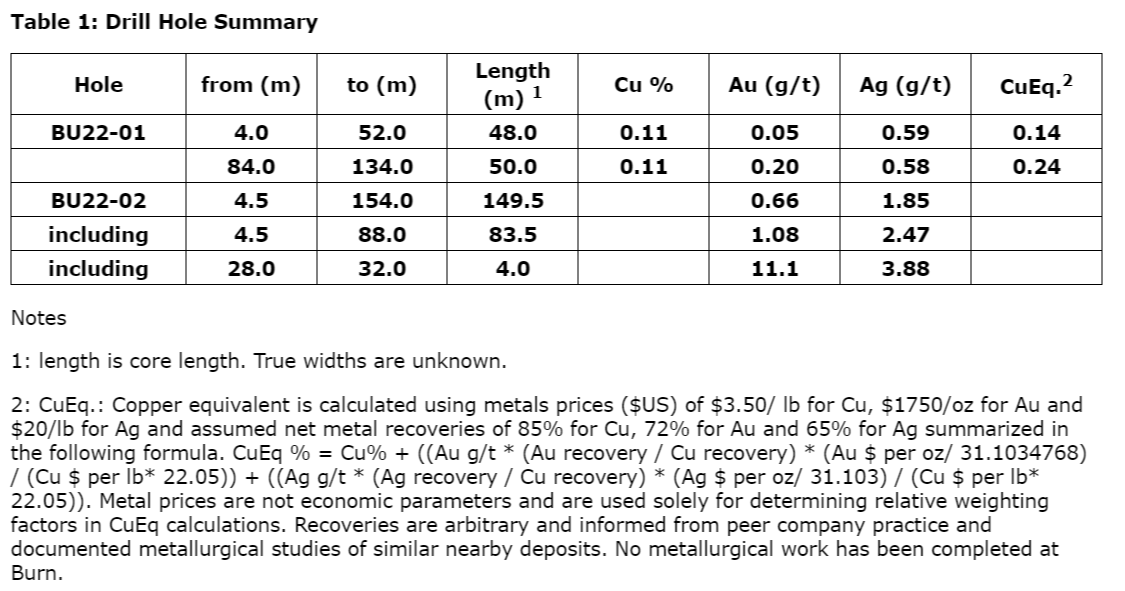 - Successful drilling in 2022 discovered a central porphyry zone in hole BU22-01, which returned 50 metres of 0.24 per cent copper equivalent, and a separate gold-rich zone in hole BU22-02, which returned 83.5 metres grading 1.08 grams per tonne gold;