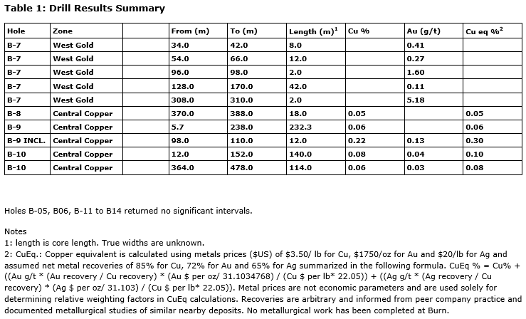 - The best results were from hole B-10 that returned 140 m of 0.1 per cent copper equivalent starting at 12 metres downhole in the Central copper zone.