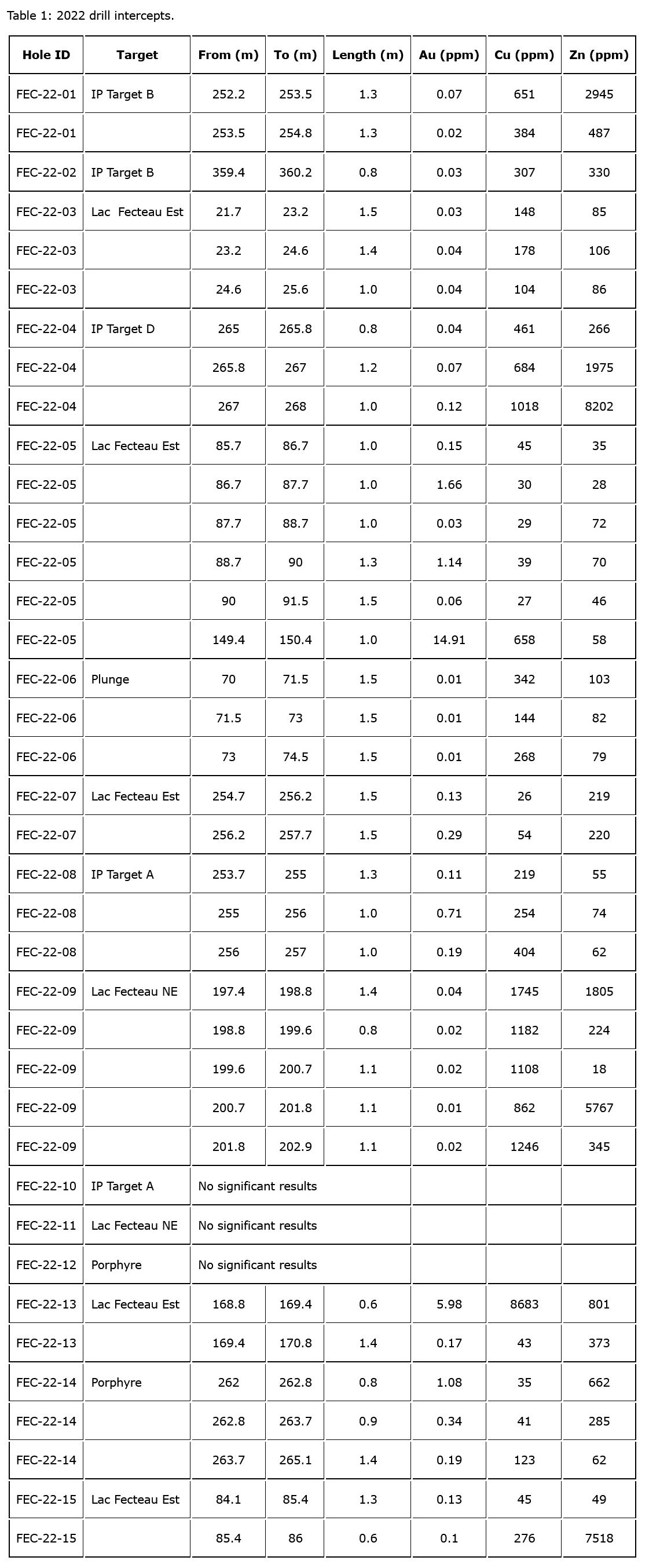 The highest grade gold intercepts were in hole FEC-22-05 and FEC-22-13 at the Fecteau East showing. The most prominent structure was encountered in FEC-22-14 which intersected 0.80m of 1.08 g/t Au at the Porphyre showing. Drill holes into the VMS targets successfully intercepted exhalative material containing disseminated to locally massive sulphides and returned anomalous Cu and Zn values in holes FEC-22-04 and FEC-22-09. A total of 1360 samples were submitted to the lab, results are summarized in table 1. The Property has full coverage with triaxial airborne magnetic response.