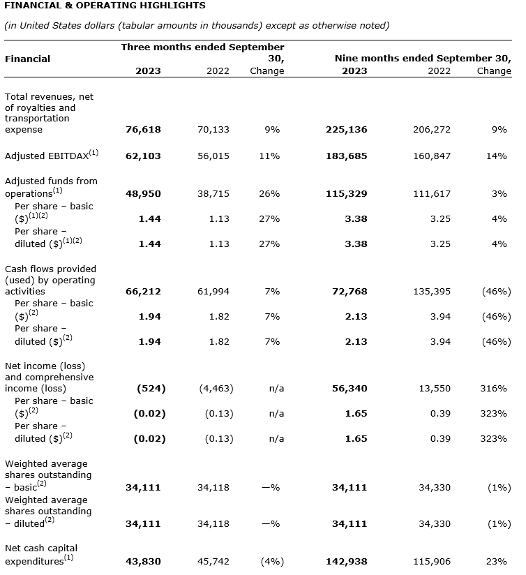 Adjusted funds from operations increased 26 per cent and 3 per cent to $49-million and $115.3-million for the three and nine months ended Sept. 30, 2023, respectively, compared with $38.7-million and $111.6-million for the same periods in 2022, respectively, mainly due to an increase in EBITDAX.