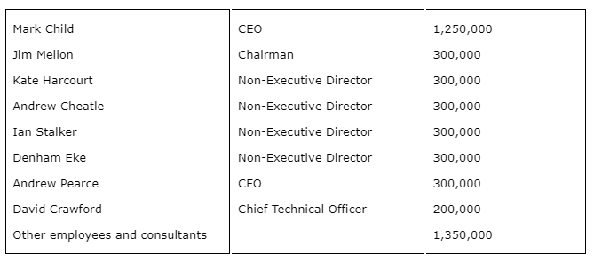 Following the grant of the 2023 options outlined herein, the total share options outstanding will represent 10.49 per cent of the total number of 187,457,491 ordinary shares in issue, this number includes the 6,666,667 new ordinary shares allotted and to be issued to Galloway Ltd. (see news release dated July 4, 2023).