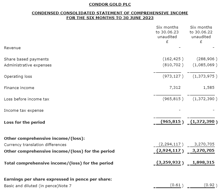 Condor Gold PLC has published its unaudited interim financial results for the six-month period to June 30, 2023.