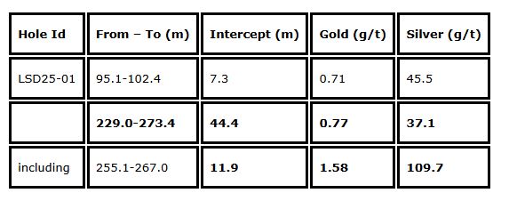 In 2025, two holes totalling 568 metres were completed, with one returning an intercept of 44.4 metres grading 0.77 g/t gold and 37.1 g/t silver demonstrating the great potential of this road-accessible project.