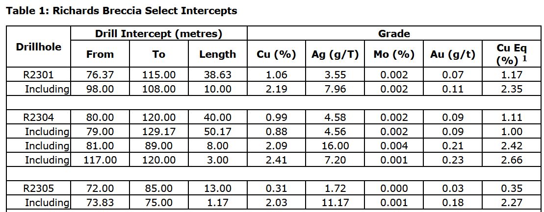 The company continues to analyze the structural framework of the Richards breccia regarding the negative results of R-23-02 and R-23-03, but it is initially interpreted that the breccia has been fault displaced to both the east and the west.