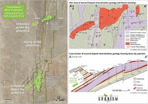 Approximately 130,000 tonnes were historically mined from the Huemul Mine averaging 0.21% U3O8, 2.0% Cu and 0.11% V2o5, while the production from the adjacent Agua Botada deposit averaged approximately 0.13% U3O8 and 0.10% Cu. The hypogene ore-related minerals at Huemul-Agua Botada include pitchblende, pyrite, marcasite, chalcopirite, bornite, sphalerite and galena, and in the overlying supergene zone uranophane, carnotite, torbenite, malachite, azurite, neoticite and roscolite.