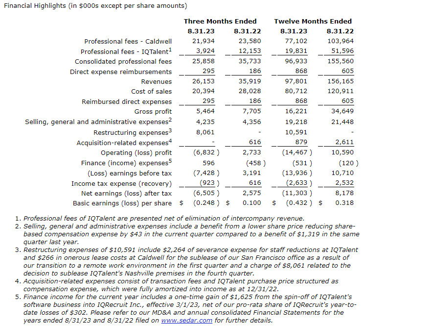 The Caldwell Partners International Inc. today released its financial results for the fiscal 2023 fourth quarter and full year ended Aug. 31, 2023. All references to quarters or years are for the fiscal periods unless otherwise noted and all currency amounts are in Canadian dollars.