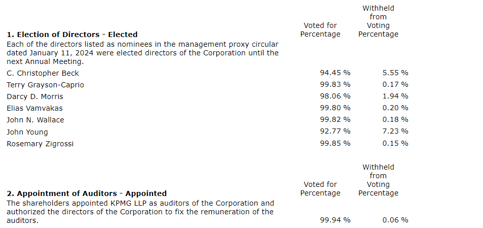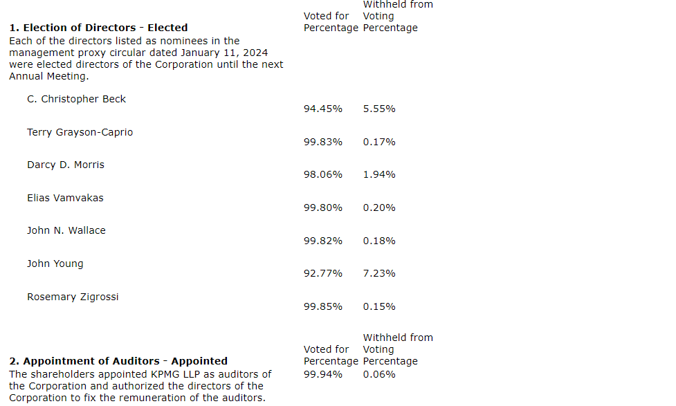Each of the directors listed as nominees in the management proxy circular dated Jan. 11, 2024, were elected directors of the corporation until the next annual meeting.