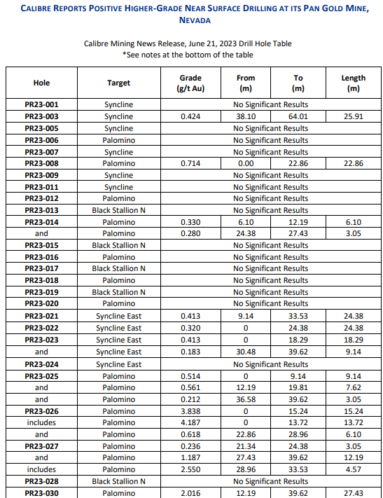 CALIBRE REPORTS POSITIVE HIGHER-GRADE NEAR SURFACE DRILLING AT ITS PAN GOLD MINE, NEVADA; INITIAL RESULTS INCLUDE 3.84 G/T GOLD OVER 15.2 METRES AND 2.08 G/T GOLD OVER 27.4 METRES