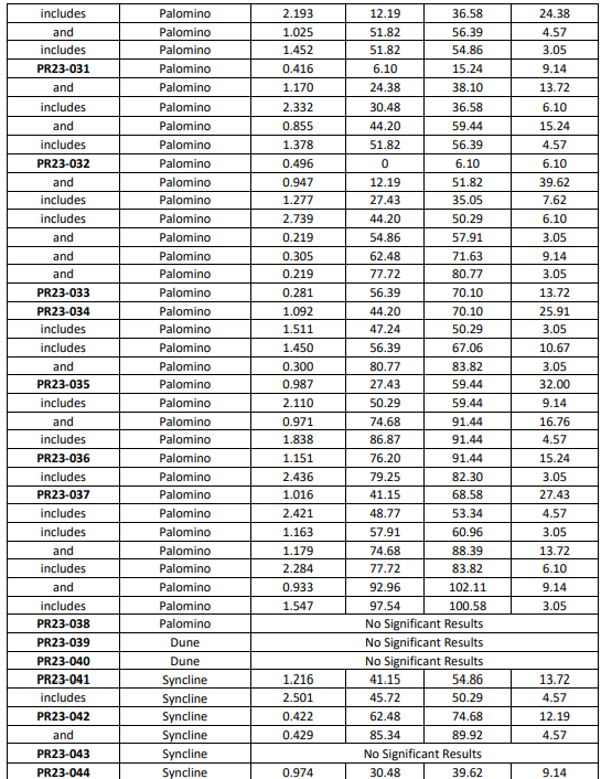 - 1.02 g/t Au over 27.4 m, including 1.18 g/t Au over 13.7 g/t Au in hole PR23-037;