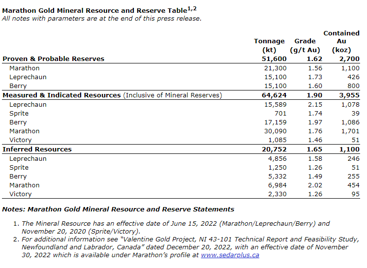 Disclosure of a scientific or technical nature with respect to Marathon and its assets in this news release has been approved by Gil Lawson, PEng (Ontario), chief operating officer for Marathon, and David Ross, PGeo (Newfoundland), vice-president, geology and exploration, for Marathon. Mr. Lawson and Mr. Ross are qualified persons under National Instrument NI 43-101. Roy Eccles, PGeo (Newfoundland), of Apex Geoscience Ltd., is a qualified person for purposes of NI 43-101, is independent of Marathon and Valentine, and has reviewed and takes responsibility for the updated 2022 mineral resource estimate prepared by John T. Boyd Company.