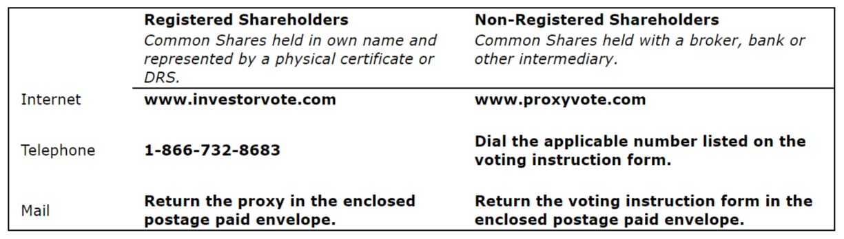 Calibre shareholders are encouraged to vote in advance of the Meeting, even if they plan to virtually attend the Meeting, to ensure their vote is received in a timely manner. Calibre shareholders are encouraged to vote today via the internet or telephone, as outlined below.
