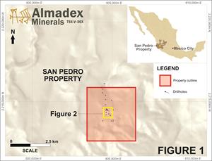 Almadex acquired the San Pedro project by staking. The property comprises approximately 1,000 hectares with multiple targets, located approximately 18 kilometers southeast from Juchitlan, 93 kilometers southwest of Guadalajara and 85km from the Barqueño project (Guachinango) of Agnico-Eagle.