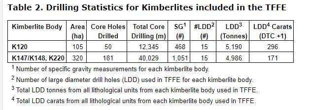The TFFE has been calculated using macrodiamond results from existing LDD holes and incorporates the average LDD grade adjustment factors used in previous evaluations of the Star and Orion South kimberlites. The TFFE calculation procedures were found to reproduce the existing Star and Orion South resource models to well within the variance envelope of the underlying data sets and the errors inherent in the estimation procedures employed.