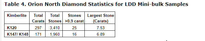 LDD mini-bulk samples from Orion North K120 and K147/K148 have yielded a significant number of diamonds 0.9 carat and above. The elevated proportion of these larger diamonds in LDD mini-bulk samples is anomalous and speaks to the potential for a coarse diamond size frequency distribution in these Orion North kimberlites.