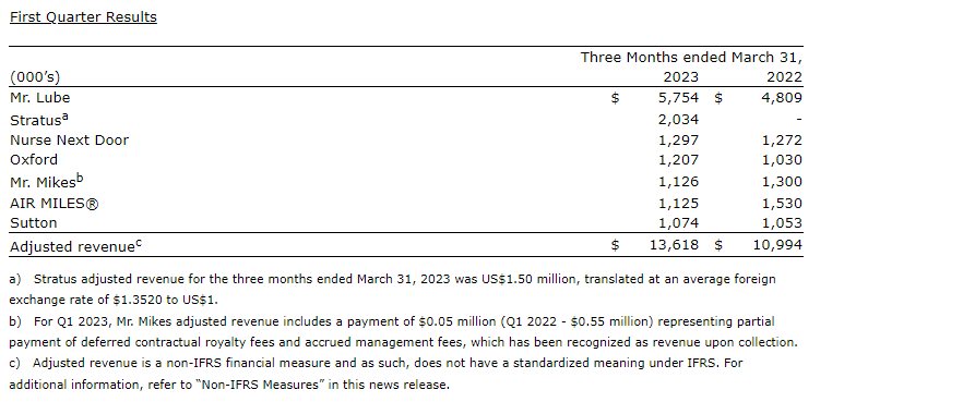 In Q1 2023, Diversified Royalty generated $12.2-million of revenue compared with $9.6-million in Q1 2022. After taking into account the DIV royalty entitlement (defined herein) related to Diversified Royalty's royalty arrangements with Nurse Next Door Professional Homecare Services Inc., Diversified Royalty's adjusted revenue was $13.6-million in Q1 2023, compared with $11.0-million in Q1 2022. Adjusted revenue increased primarily due to positive trends experienced by most of Diversified Royalty's royalty partners, as discussed in further detail herein. In addition, incremental revenue was generated from the addition of four net new stores to the Mr. Lube Canada LP royalty pool on May 1, 2022, plus incremental royalty income generated from Stratus (defined herein) beginning on Nov. 15, 2022.