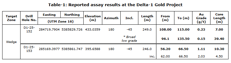 Ron Kopas, chief executive officer (interim) of Delta, commented: "The discovery of a potential new gold zone at Nova target in the Wedge area highlights the exceptional upside for additional significant discoveries across our extensive Delta-1 property. This is particularly encouraging given our success at the Shabaqua target (see Delta's Jan. 12, 2026, press release), where autumn drilling returned 4.25 grams over 11.8 metres. As we continue to advance the Eureka gold deposit through infill and metallurgical work, we believe the ongoing discoveries of additional gold sources on the Delta-1 property, that could be developed synergistically with the Eureka deposit, continue to strengthen the project economics in this low-cost jurisdiction. This opportunity is further strengthened by our strategic location just 50 kilometres from Thunder Bay, which is an established hub for mining operations in Northern Ontario, where we are seeing increasing positive results from neighbouring projects (see recent Gold X2 press release).
