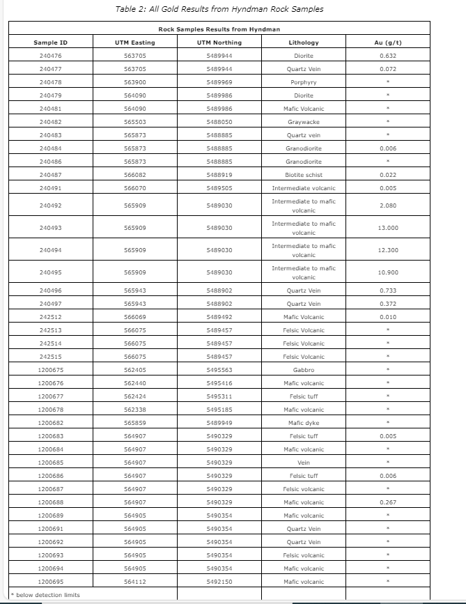 Maura Kolb, the company's president and head of exploration, commented on Hyndman: "The team feels that multiple showings of over 10 g/t Au represent our first important target at Hyndman. We will continue to test the potential of gold mineralization hosted within the mafic volcanic rocks on and along the Wabigoon fault. The shearing is very strong and pervasive throughout these rocks mapped by the summer field team and the new results demonstrate strong growth potential along the Wabigoon fault."
