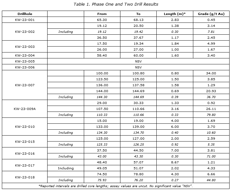 • Confirmed orientation and expanded historically delineated high-grade shoot with new holes KW-23-016 which intersected 3.81 g/t gold over 7.00 m including 71.00 g/t gold over 0.30 m and KW-23-018 intersecting 6.66 g/t gold over 4.30 m including 44.80 g/t gold over 0.27 m.