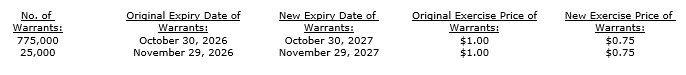 None of the warrants have been exercised as of the date hereof. All other terms of the warrants will remain unchanged. In accordance with the requirements of the Canadian Securities Exchange, the terms of any warrants issued as compensation warrants or as finder warrants are not eligible for amendment. The amendments are subject to the final approval of the CSE.