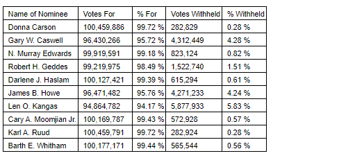 All other matters put before the meeting passed, including the non-binding, advisory vote on the corporation's approach to executive compensation.