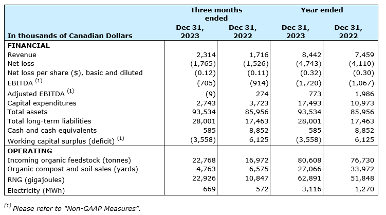 Revenues of $2.3-million and $8.4-million for Q4 and fiscal year 2023 increased 35 per cent and 13 per cent, respectively, from $1.7-million and $7.5-million for Q4 and fiscal year 2022, primarily due to incremental RNG (renewable natural gas) production from the completion of the phase I RNG expansion project at GrowTEC and the commencement of the 10-year organic waste processing agreement with the City of Regina. Revenues are expected to continue to increase in future periods, relative to previous periods, following the completion and ramp-up of the Fraser Valley biogas RNG expansion project.
