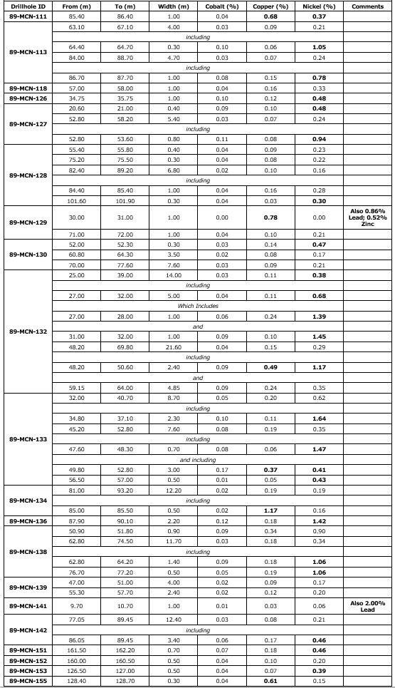 • Highlights in the North zone include hole 89-MCN-132, which intersected two wide zones that graded 0.03 per cent cobalt, 0.11 per cent copper and 0.38 per cent nickel over 14.00 metres from 25.00 m, and 0.04 per cent Co, 0.15 per cent Cu and 0.29 per cent Ni over 21.60 m from 48.20 m, which includes 0.09 per cent Co, 0.49 per cent Cu and 1.17 per cent Ni over 2.40 m from 48.20 m.