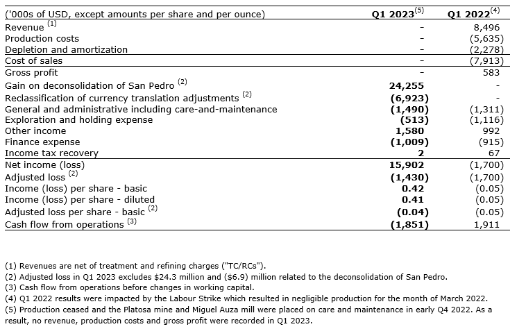 Excellon Resources Inc. has released financial results and corporate highlights for the three months ended March 31, 2023.