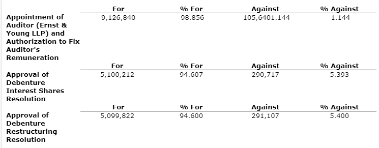 Shawn Howarth, president and chief executive officer, commented: "We are pleased to announce that the proposed debenture restructuring was approved by shareholders. Completion of the debenture restructuring, which is anticipated in the coming weeks, will allow the company to focus priorities on longer-term growth and equity recovery. We look forward to providing the market with a detailed corporate update and strategy in the near term."