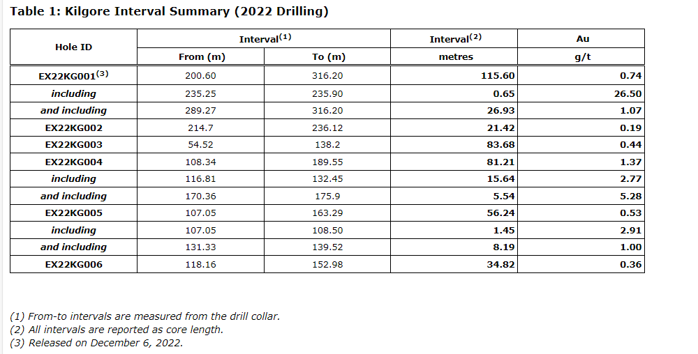 - 0.53 g/t Au over 56.24 metres in EX22KG005, including 2.91 g/t Au over 1.45 metres, successfully testing extension of the existing mineralized envelope to the southwest;