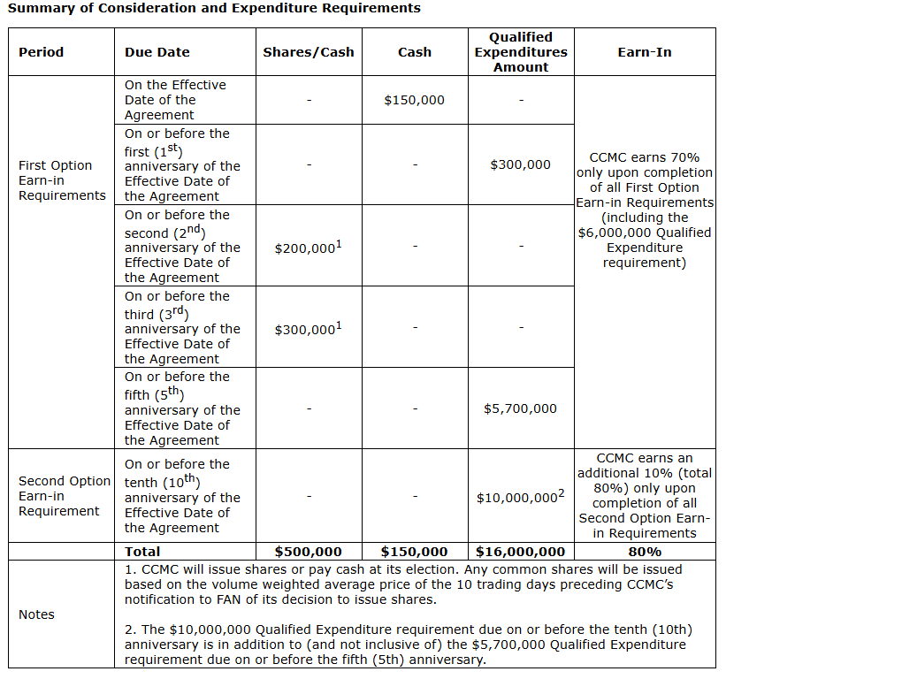 2. Cash and/or share payments to First Atlantic totalling $500,000 over the first three years of the option agreement;
