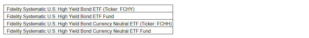 Prior to the termination date, Fidelity Systematic U.S. High Yield Bond ETF and Fidelity Systematic U.S. High Yield Bond Currency Neutral ETF will declare, pay and automatically reinvest a final distribution to investors in these funds. The final regular monthly distribution will be declared and paid in July, 2022. Additionally, Fidelity Systematic U.S. High Yield Bond ETF Fund and Fidelity Systematic U.S. High Yield Bond Currency Neutral ETF Fund will also pay and automatically reinvest a final distribution to investors in these funds.