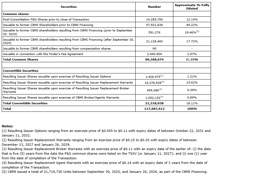 As announced in F&G's Oct. 1, 2025, news release, CBMI completed an oversubscribed financing by way of private placement 10,554,343 units at seven cents per unit for gross proceeds of $738,804.