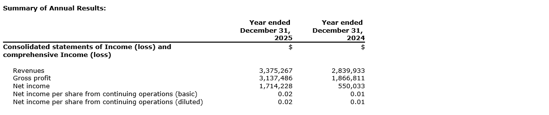 • Total income of $1,714,228 for the year ended Dec. 31, 2025 (2024 -- $550,033);