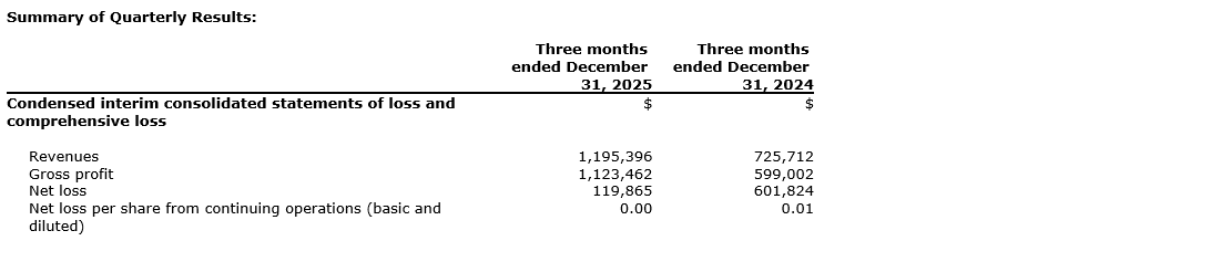 • Total revenues of $1,195,396 for the three months ended Dec. 31, 2025 (2024 -- $725,712);