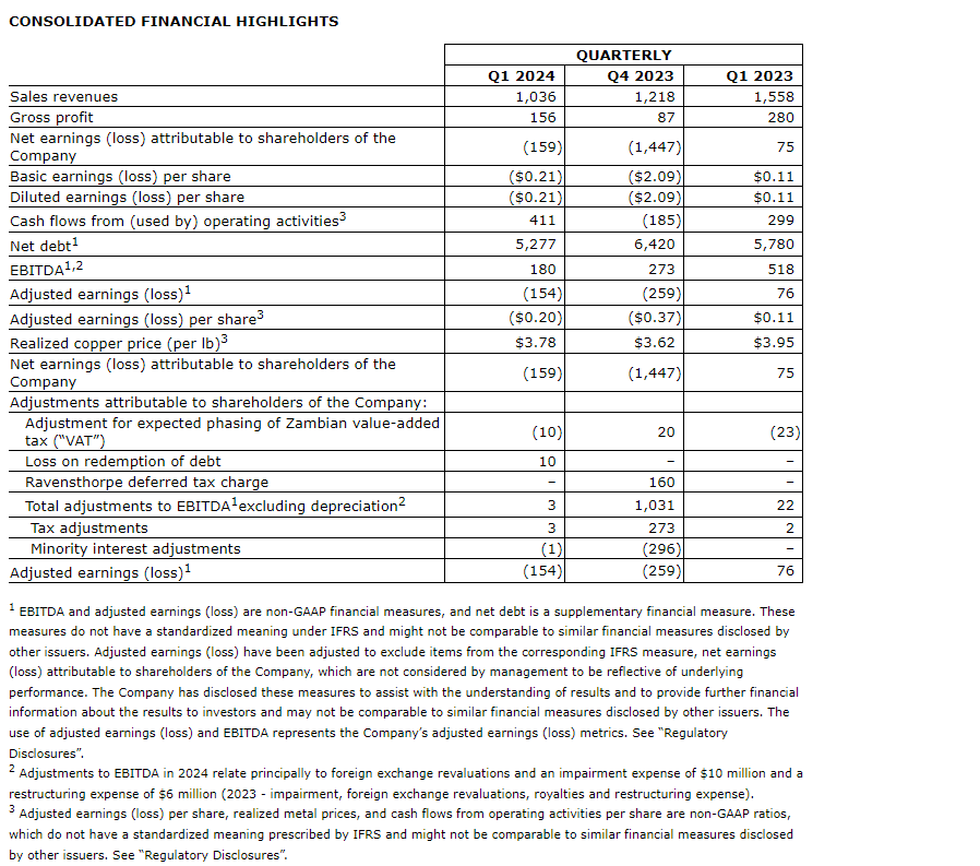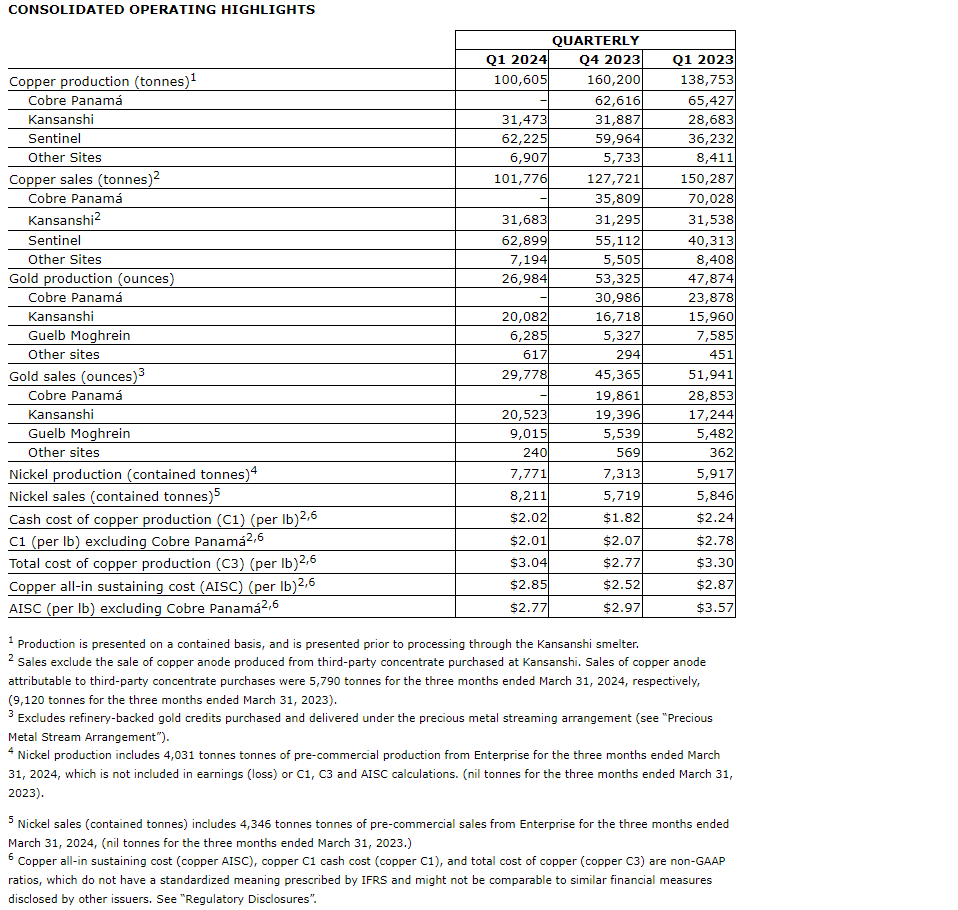 FIRST QUANTUM MINERALS REPORTS FIRST QUARTER 2024 RESULTS