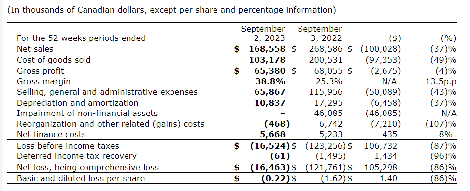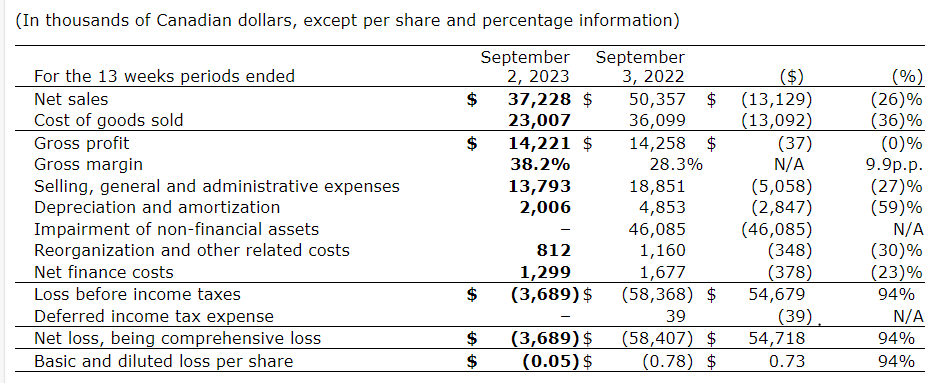 For the 13 weeks ended Sept. 2, 2023, adjusted free cash flow improved by $10.5-million compared with the corresponding period in 2022 mainly driven by lower net loss resulting primarily from lower salary base and other cost reduction initiatives as well as lower investments in capital expenditures as new facility rollouts were concluded in fiscal 2022, and fiscal 2023 was focused on maintenance and technology projects.