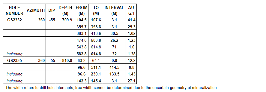 Hole GS2334 was drilled to the south, which is different from most of the drilling conducted so far, which has been largely to the north. Although GS2334 appears to have drilled over the top of the projected zone of mineralization intersected in GS2333, GS2234, still returned 443.7 metres grading 0.71 g/t Au, including 195.1 metres grading 1.06 g/t Au.